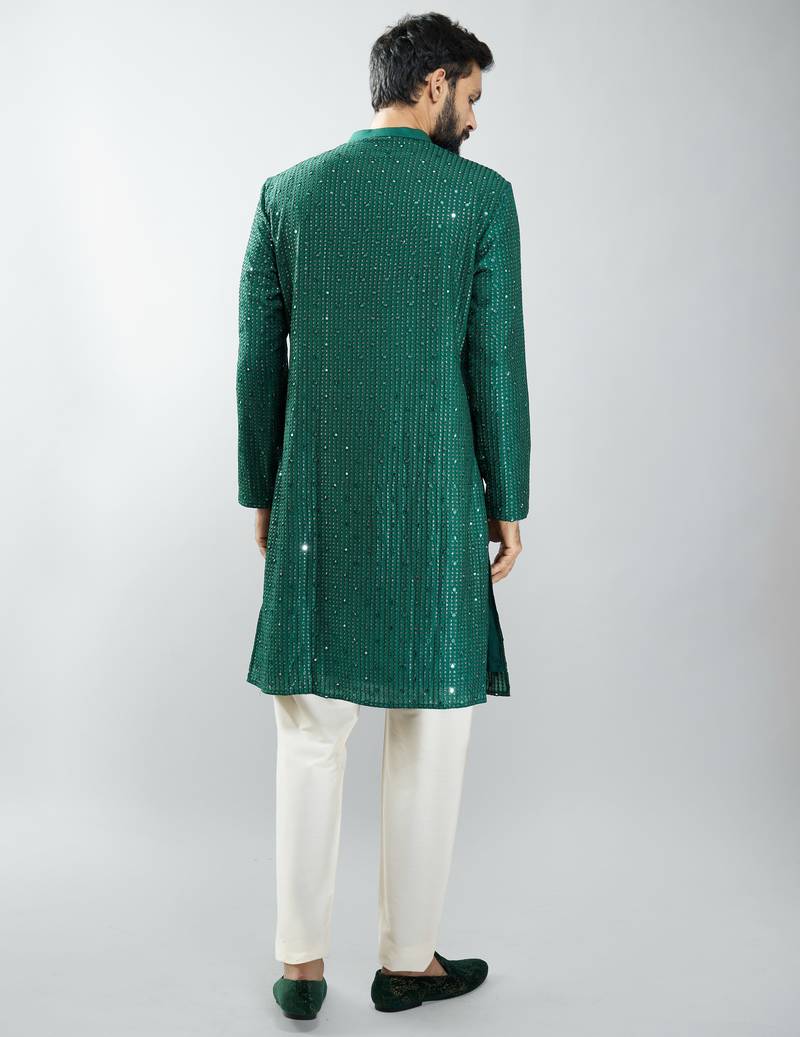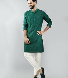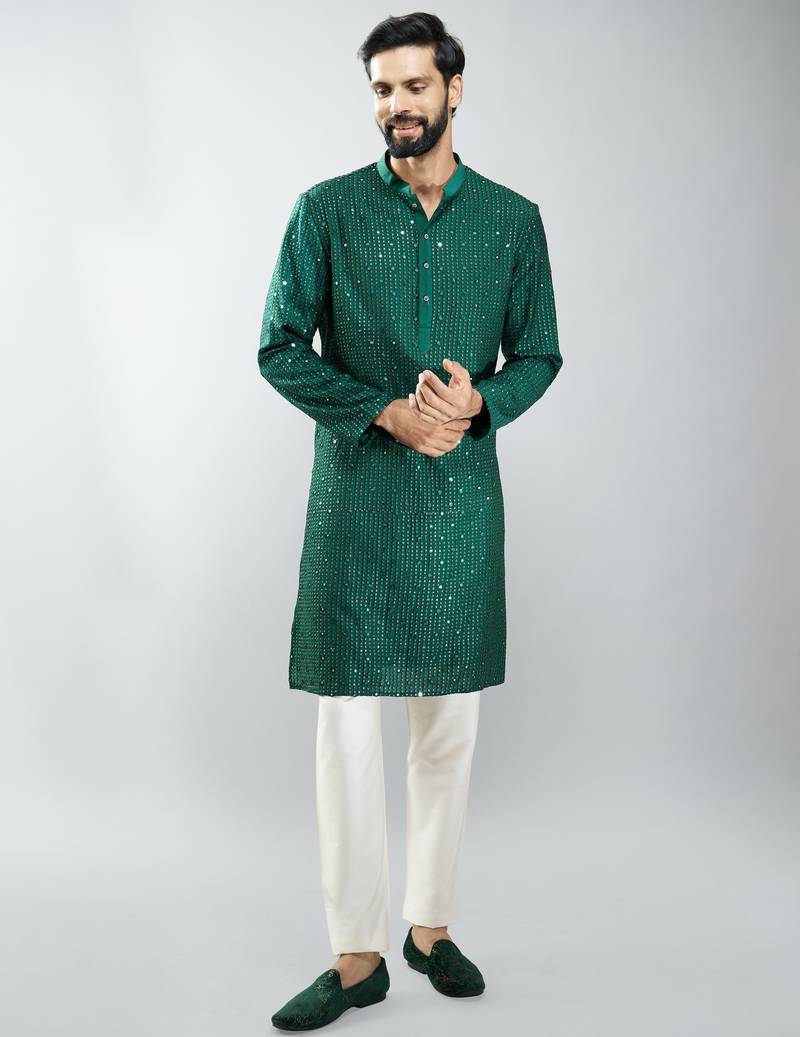 | Product Name | Men Bottle Green Silk Blend Mirror Work Kurta Set With Cream Pyjama Wedding & Festive Wear | |