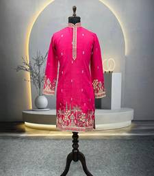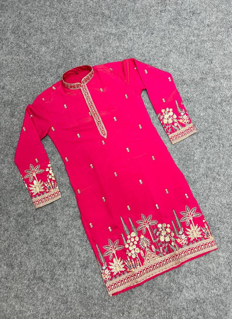 Exquisite rani pink roman shimmer kurta with multi colour embroidery work
