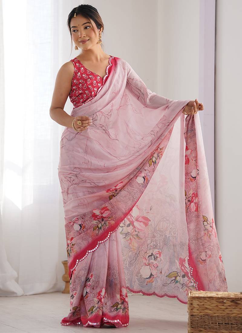 Baby pink chinon silk blend print work with mirror work border designer saree