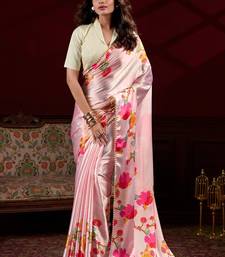 Baby pink satin silk blend digital printed pearl lace border work saree