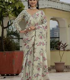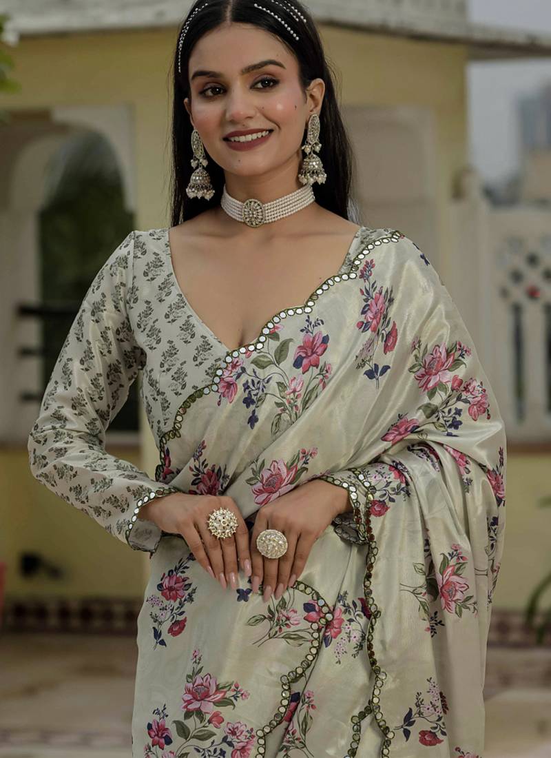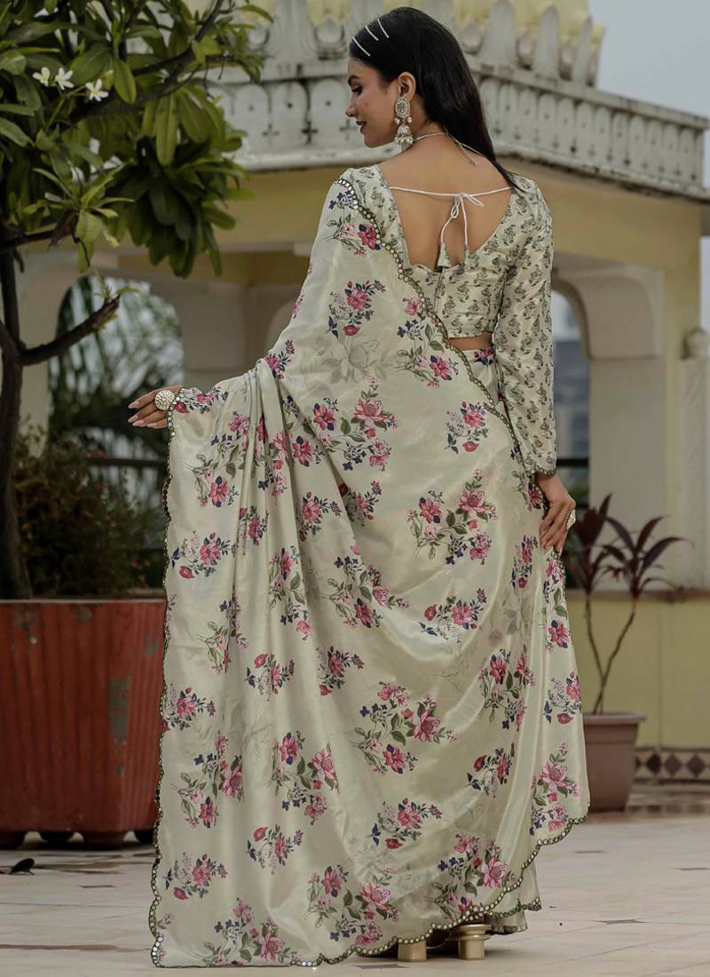 | Product Name | Beige Chinon Silk Blend Floral Printed With Mirror Cut Border Ready To Wear Saree | |