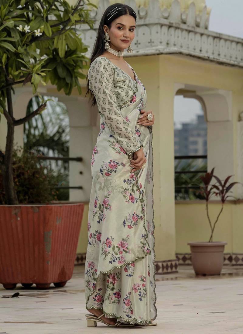 Beige chinon silk blend floral printed with mirror cut border ready to wear saree