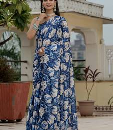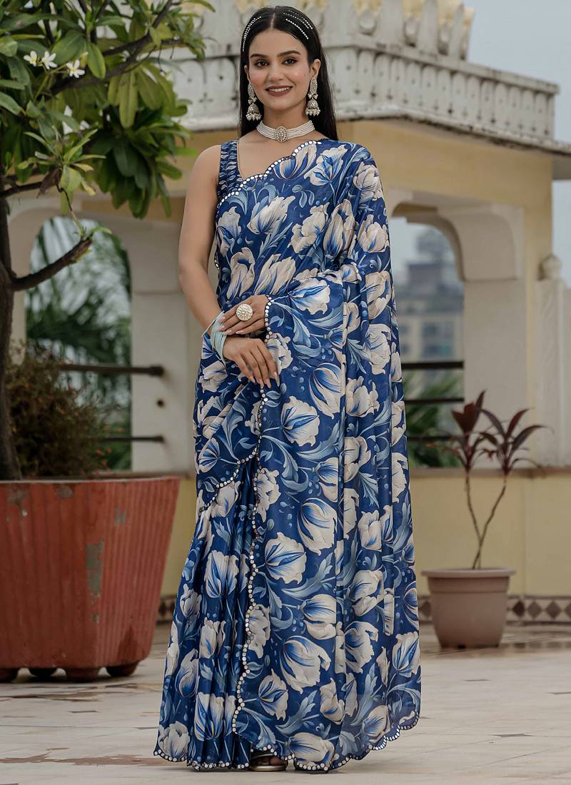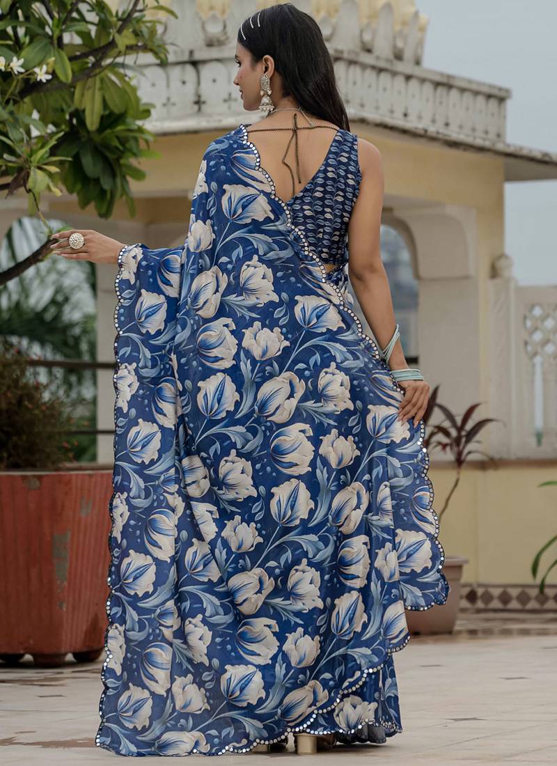 Blue chinon silk blend floral printed with mirror cut border ready to wear saree