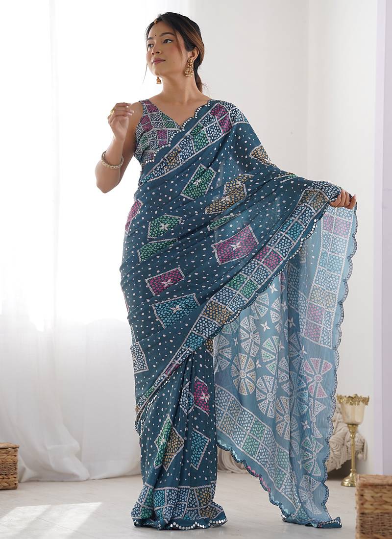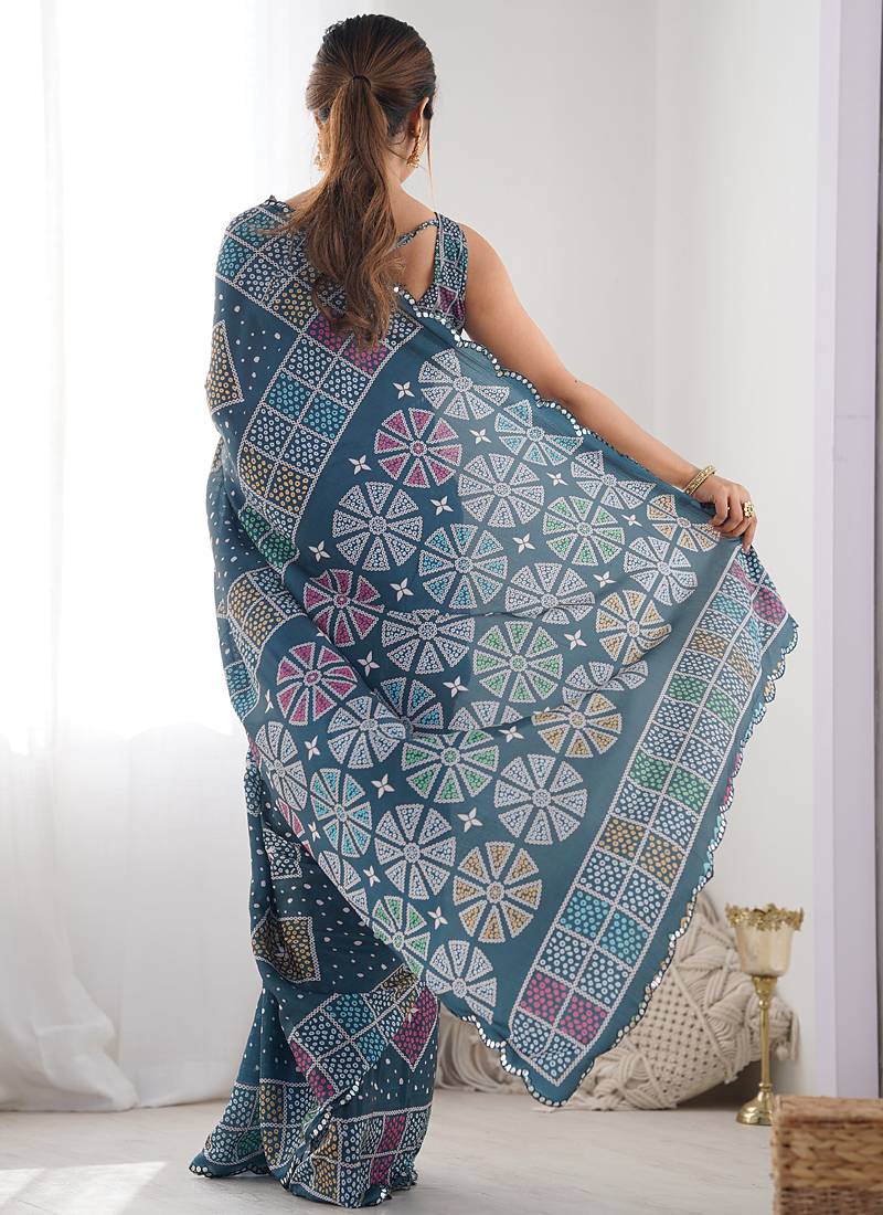 Blue chinon silk blend print work with mirror work border designer saree