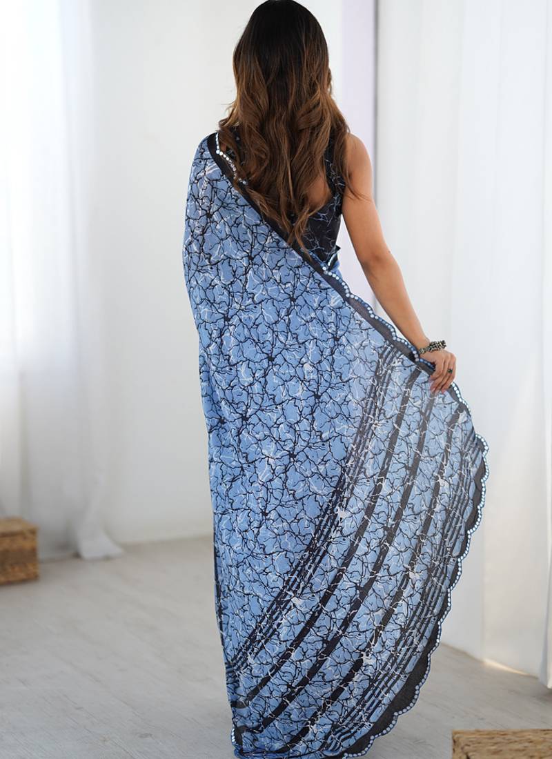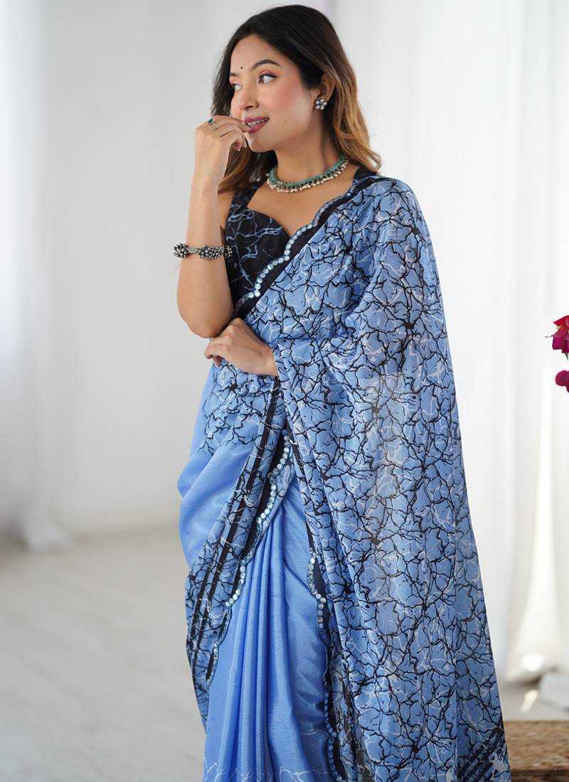 | Product Name | Blue Chinon Silk Blend Print Work With Mirror Work Border Designer Saree | |