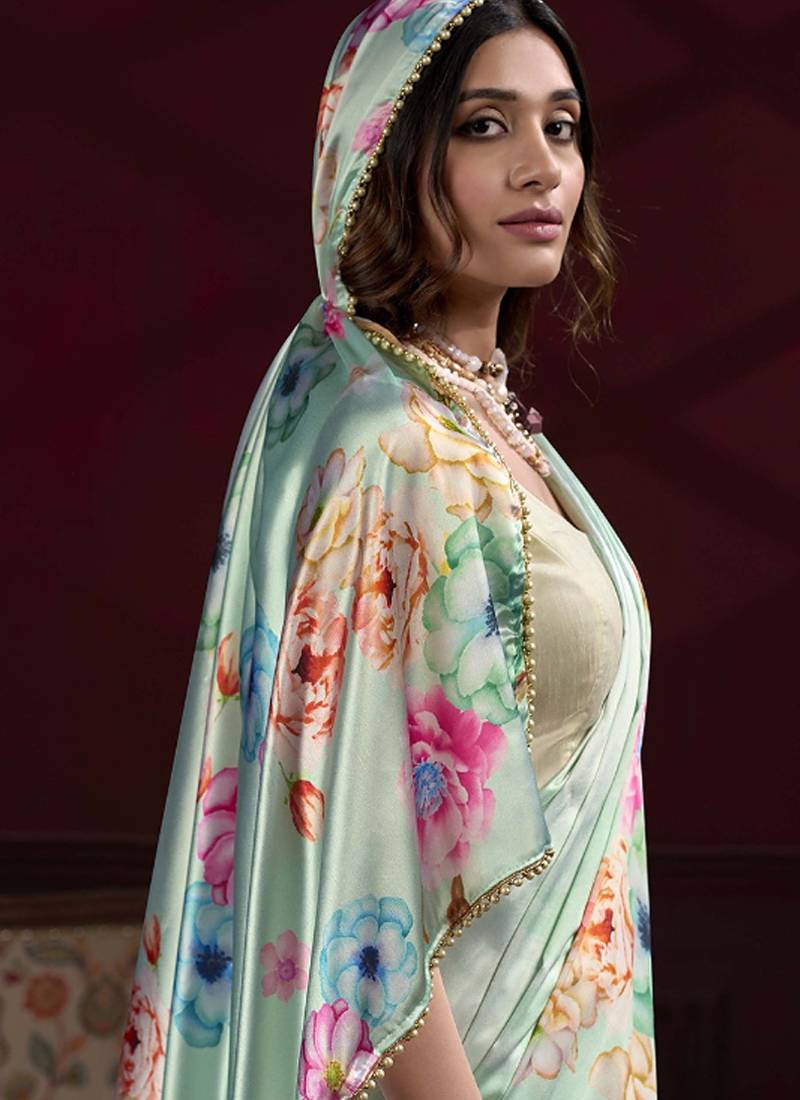 | Product Name | Light Green Satin Silk Blend Digital Printed Pearl Lace Border Work Saree | |