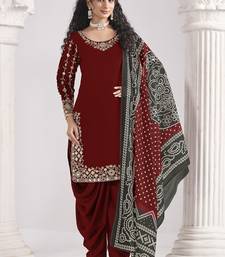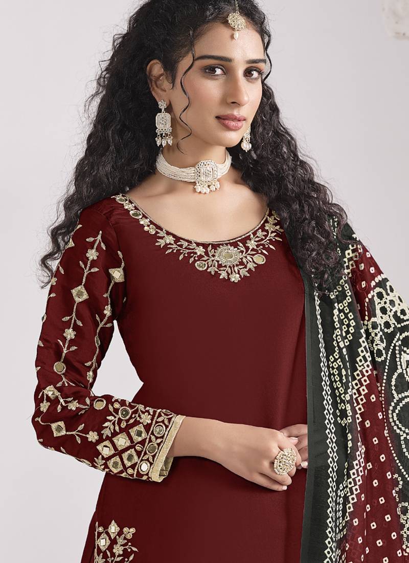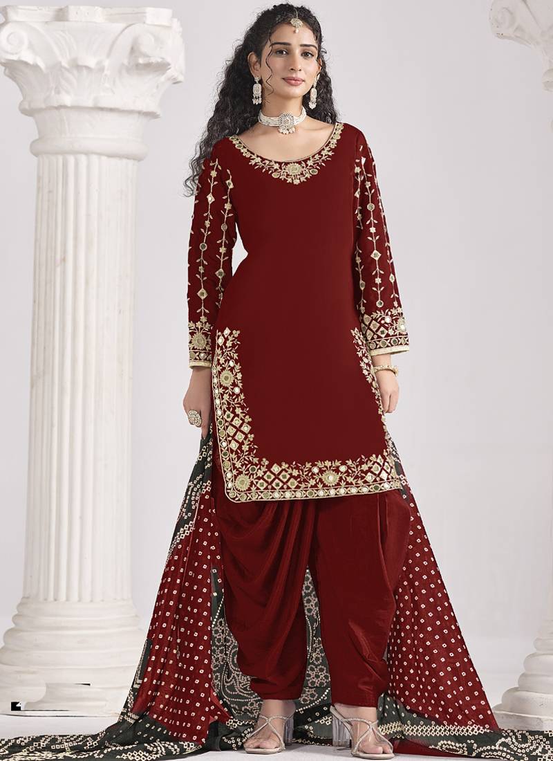 Maroon roman silk mirror work patiala suit semi stitched