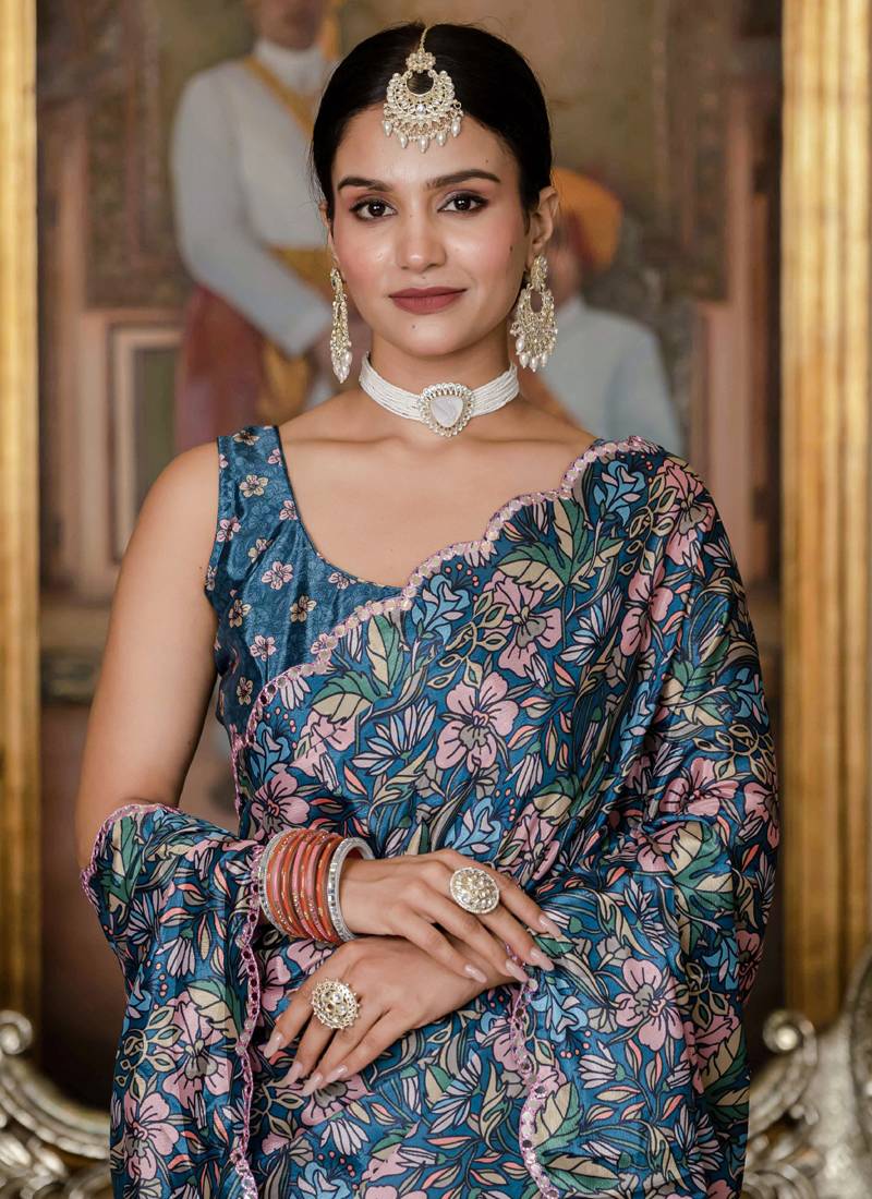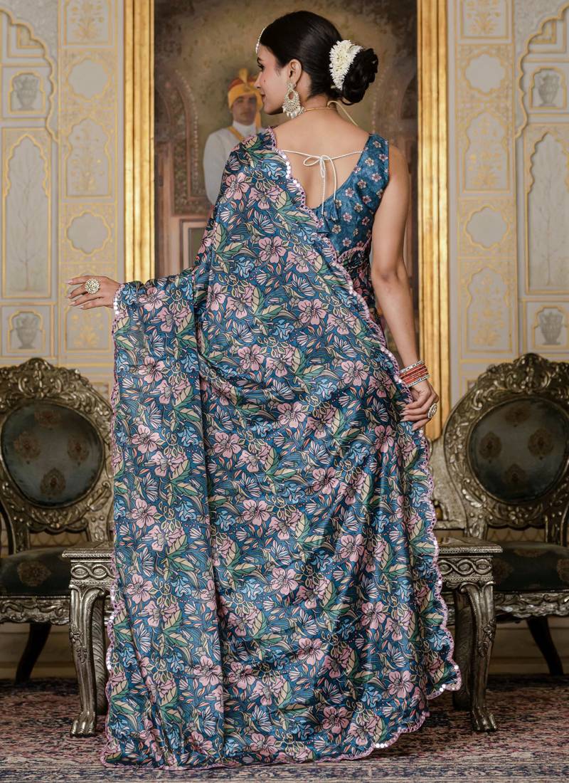 | Product Name | Multi Color Chinon Silk Blend Floral Printed Ready To Wear Saree With Mirror Work Border | |