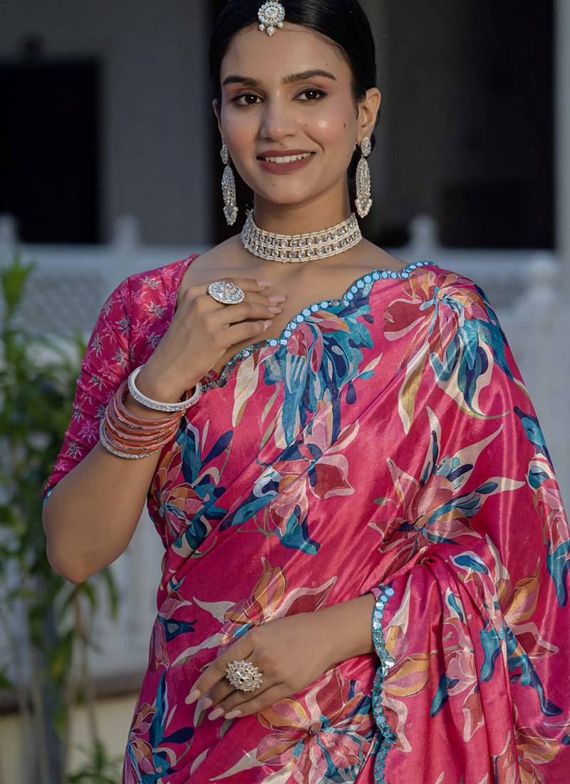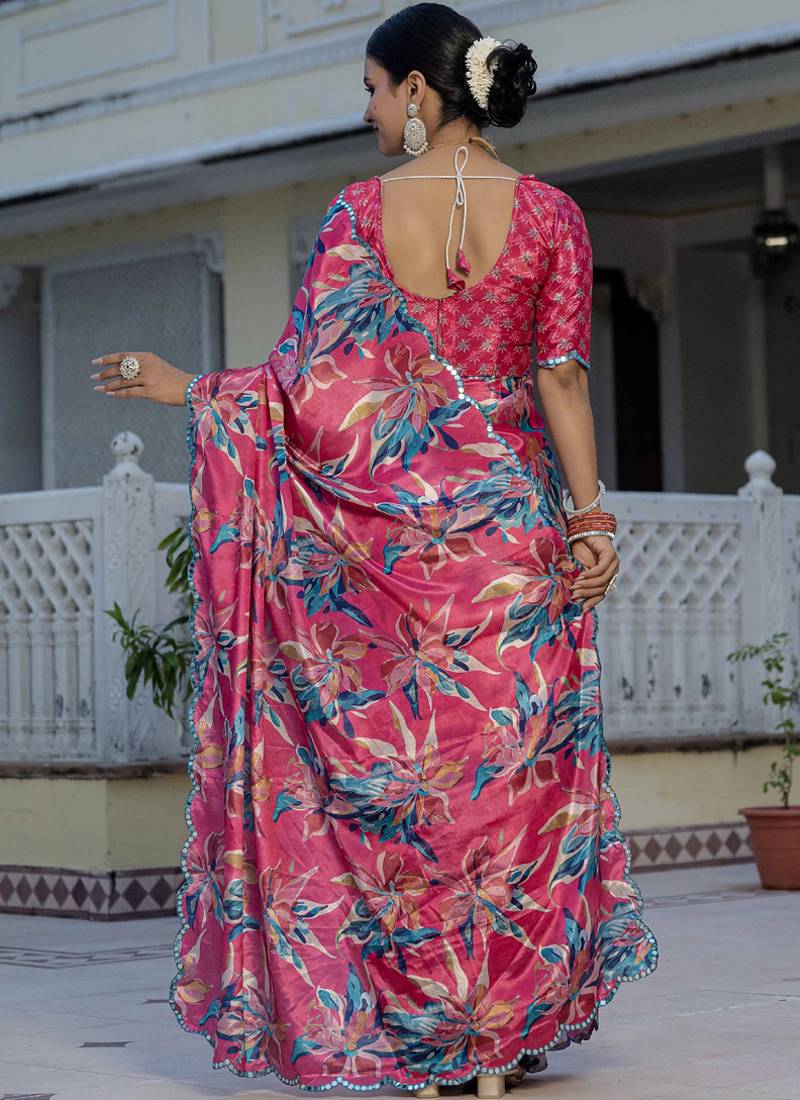 Multi color chinon silk blend floral printed ready to wear saree with mirror work border