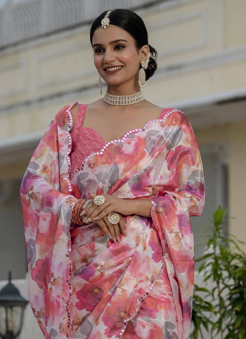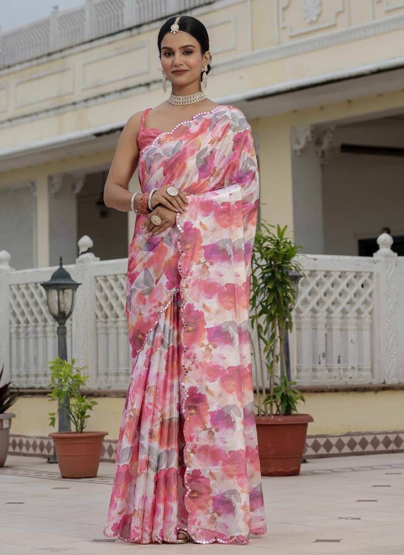 Multi color chinon silk blend floral printed with mirror cut border ready to wear saree