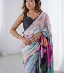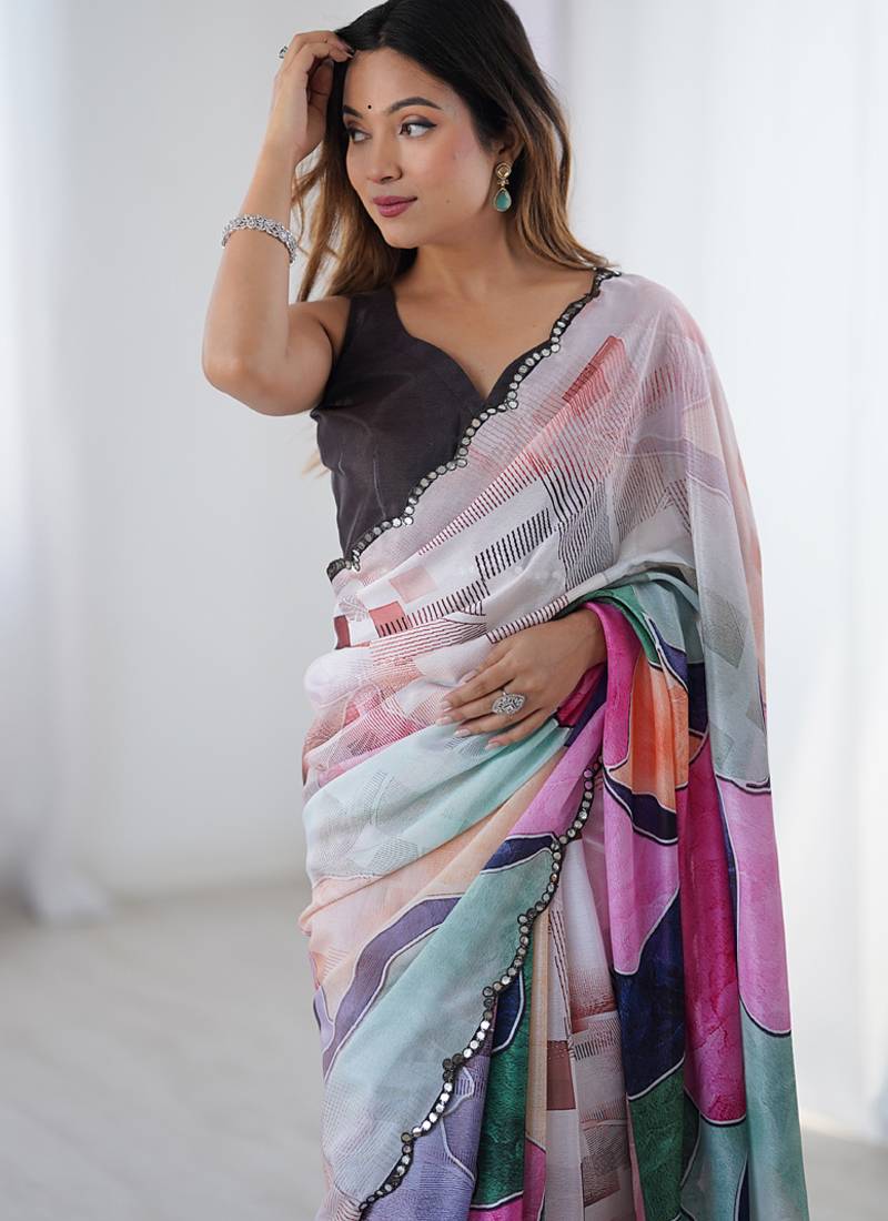 Multi color chinon silk blend print work with mirror work border designer saree
