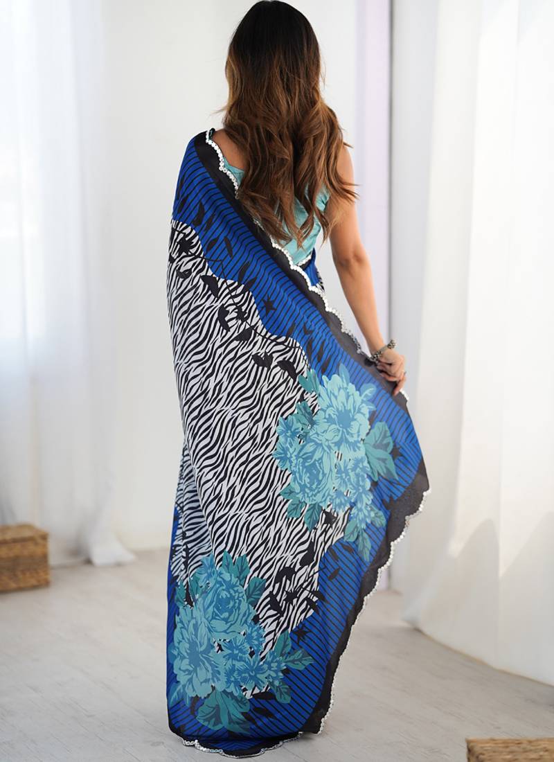 Multi color chinon silk blend print work with mirror work border designer saree
