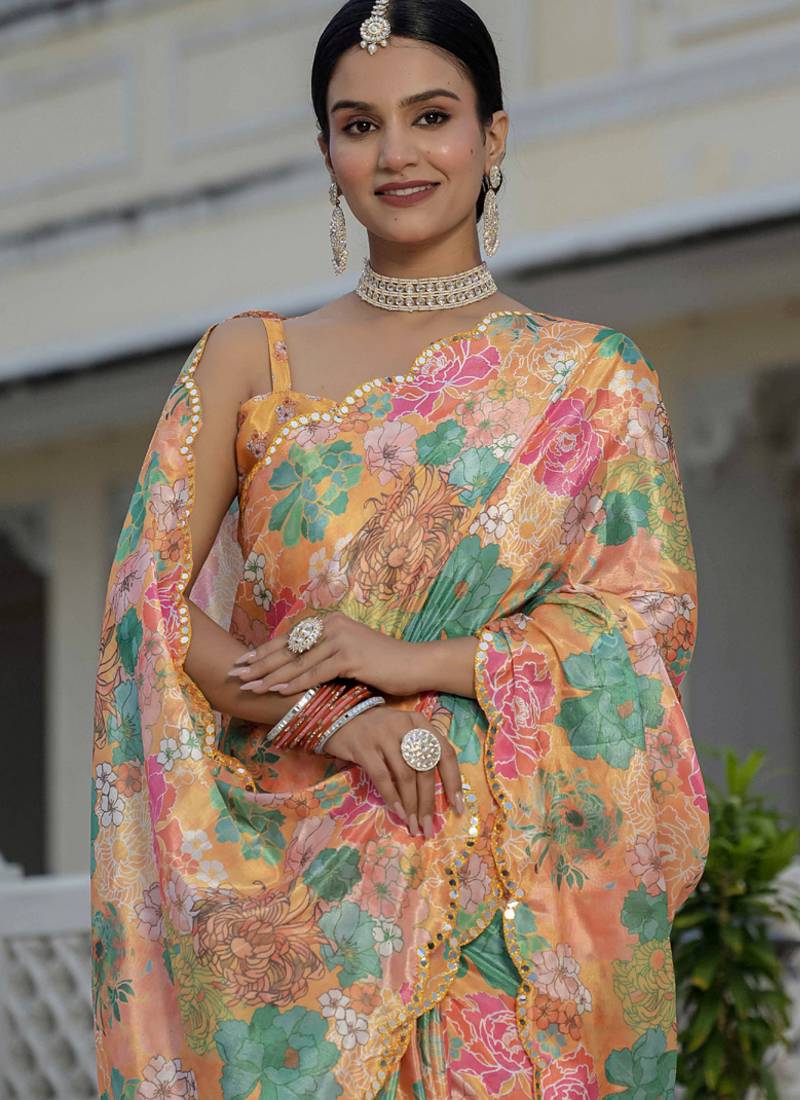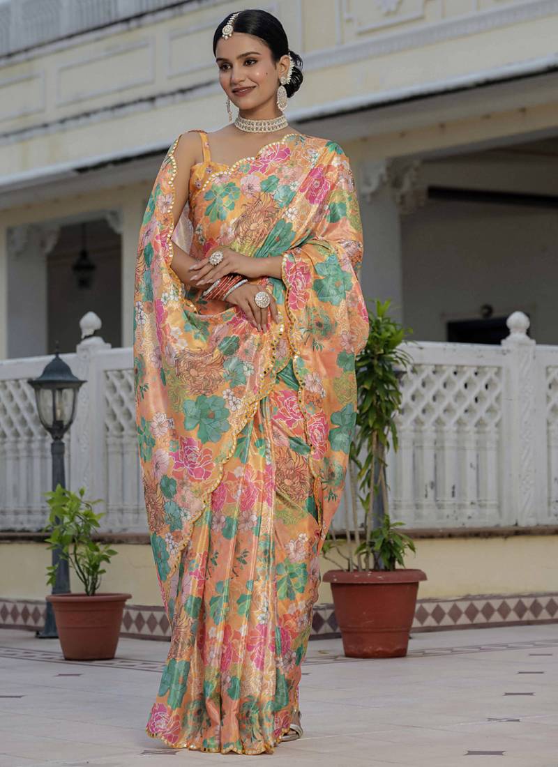 Mustard chinon silk blend floral printed with mirror cut border ready to wear saree