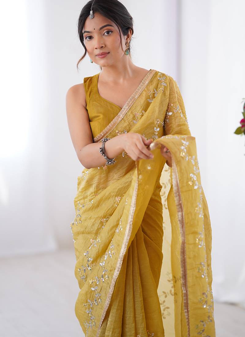 | Product Name | Mustard Organza Moti & Val Sequence Party Wear Saree | |