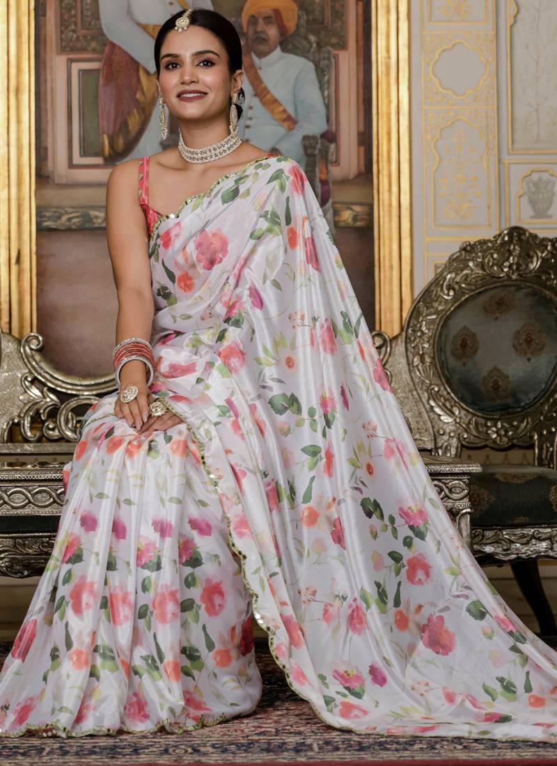 Off white chinon silk blend floral printed with mirror cut border ready to wear saree