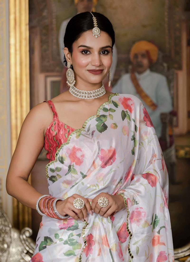 | Product Name | Off White Chinon Silk Blend Floral Printed With Mirror Cut Border Ready To Wear Saree | |