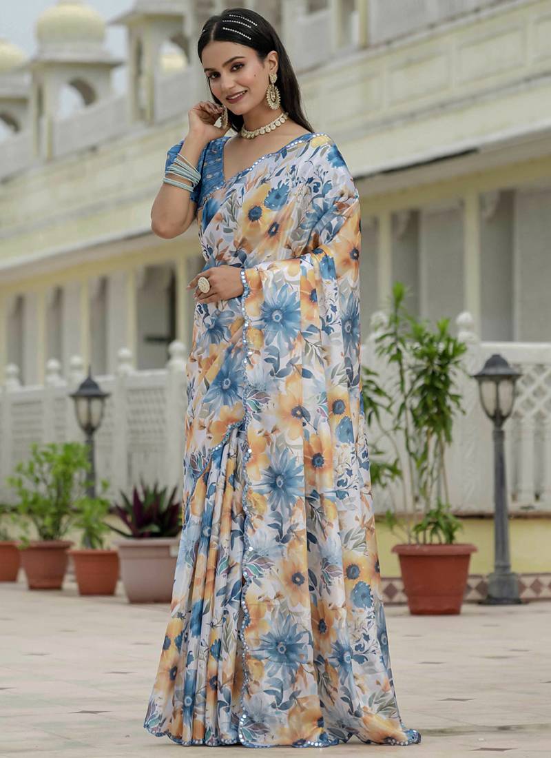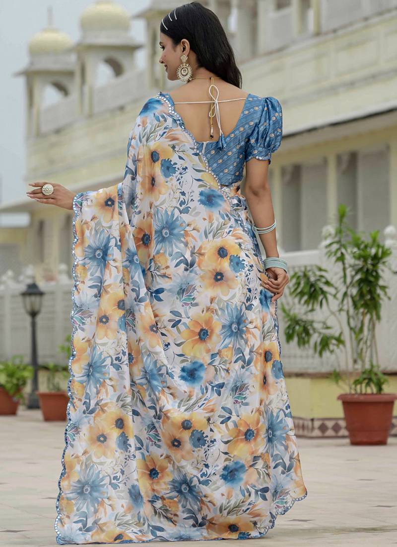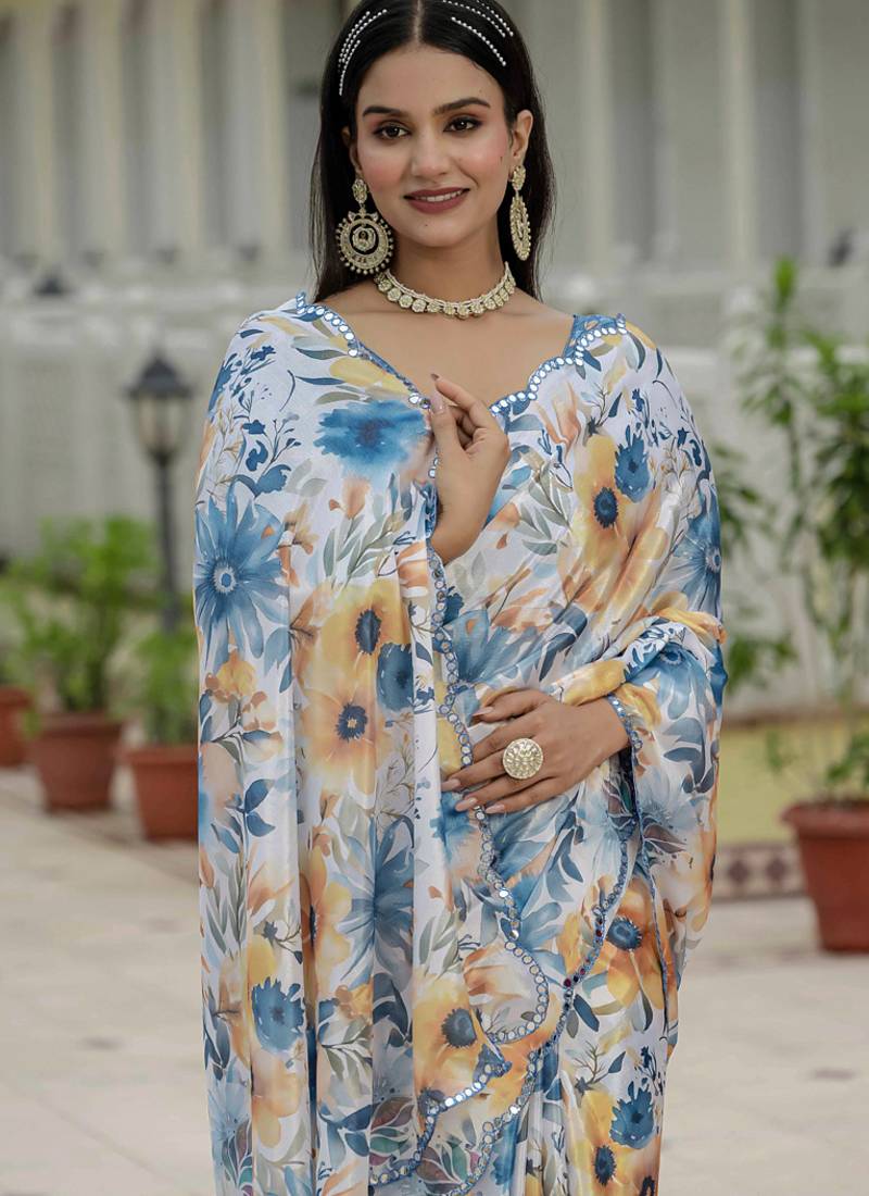 | Product Name | Off White Chinon Silk Blend Floral Printed With Mirror Cut Border Ready To Wear Saree | |
