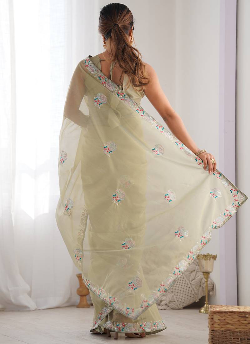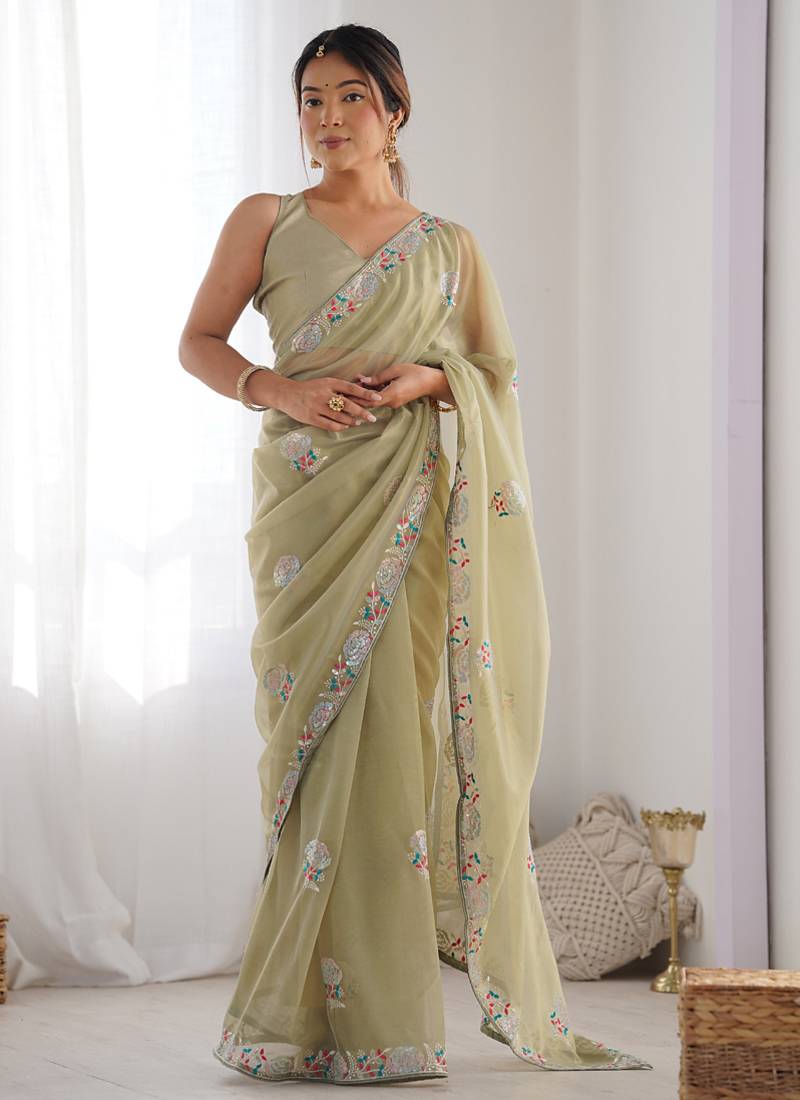 | Product Name | Olive Green Organza Thread Work Color Tone Fabric Party Wear Saree | |