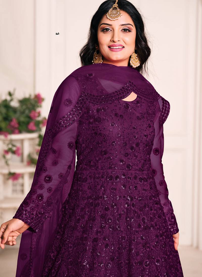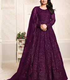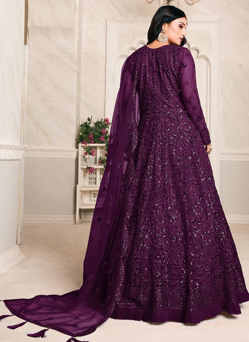 Purple net emboidered wedding wear anarkali suit semi stitched