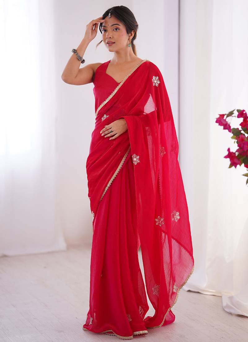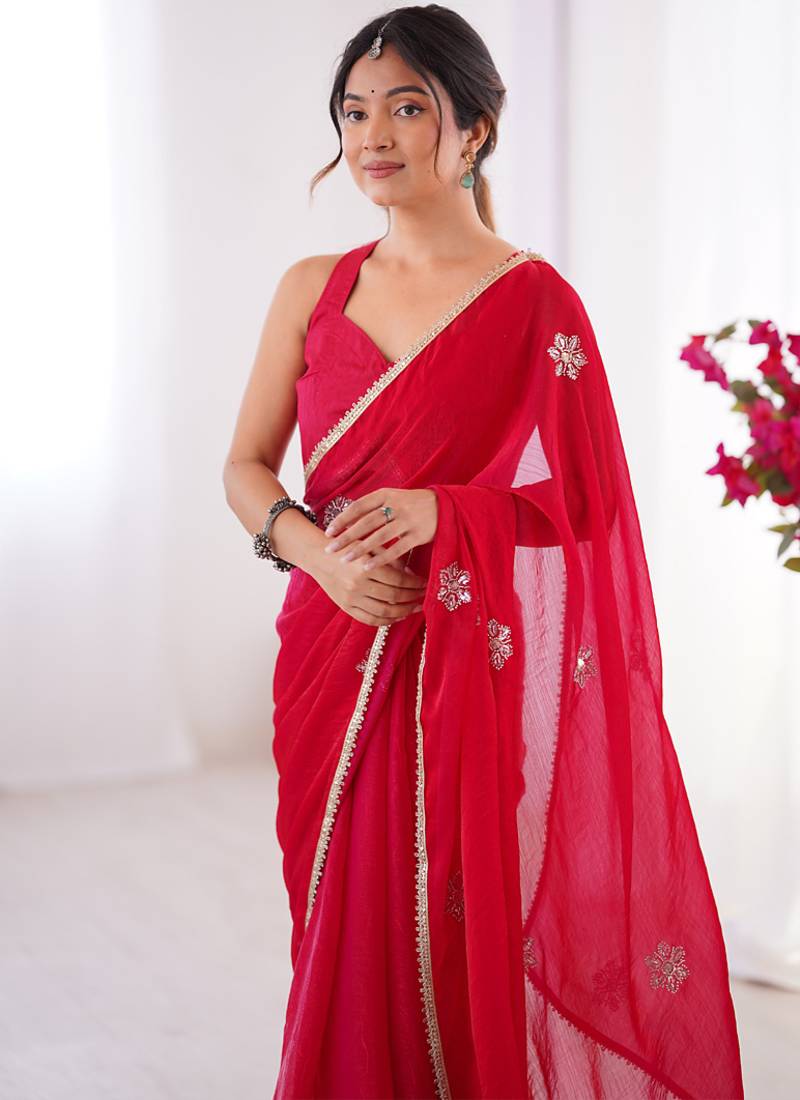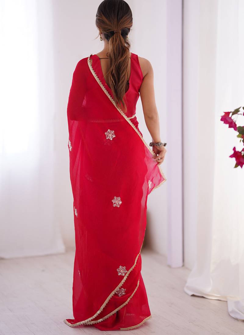 Red fandy silk blend moti & val sequence designer saree