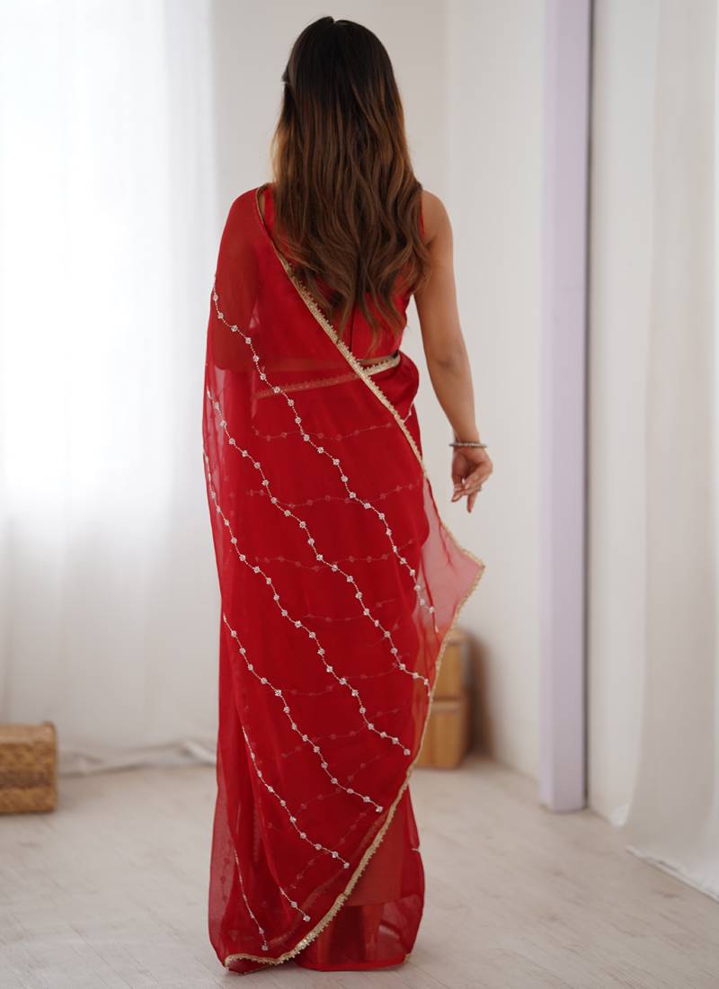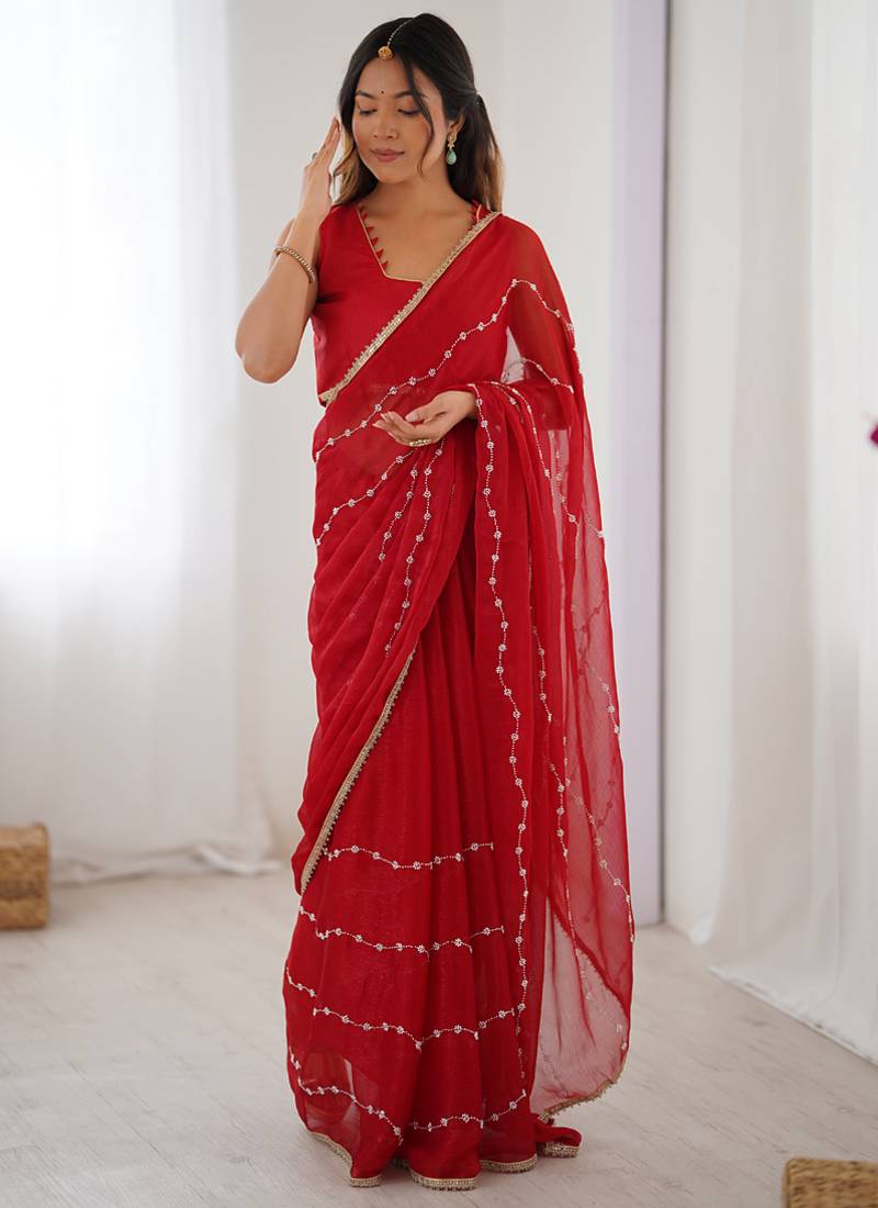 | Product Name | Red Smooth Sitara Fabric Moti & Val Sequence Designer Saree | |