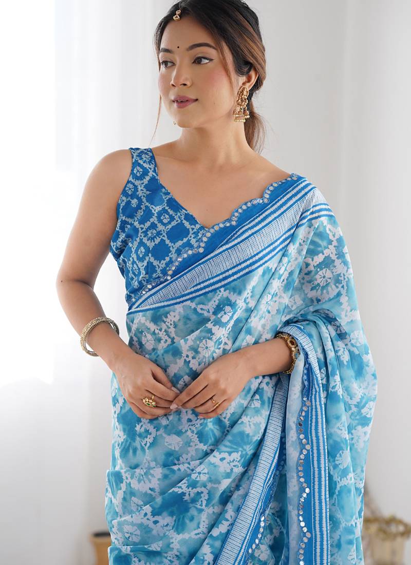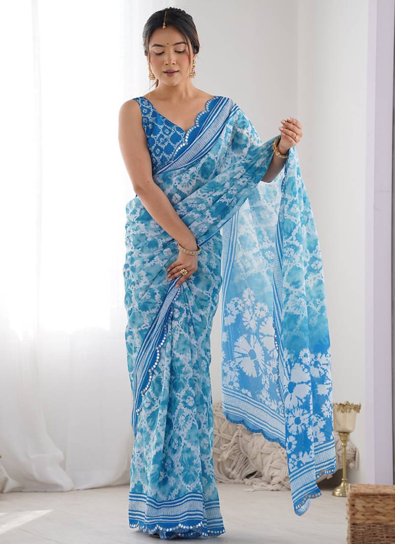 | Product Name | Sky Blue Chinon Silk Blend Print Work With Mirror Work Border Designer Saree | |