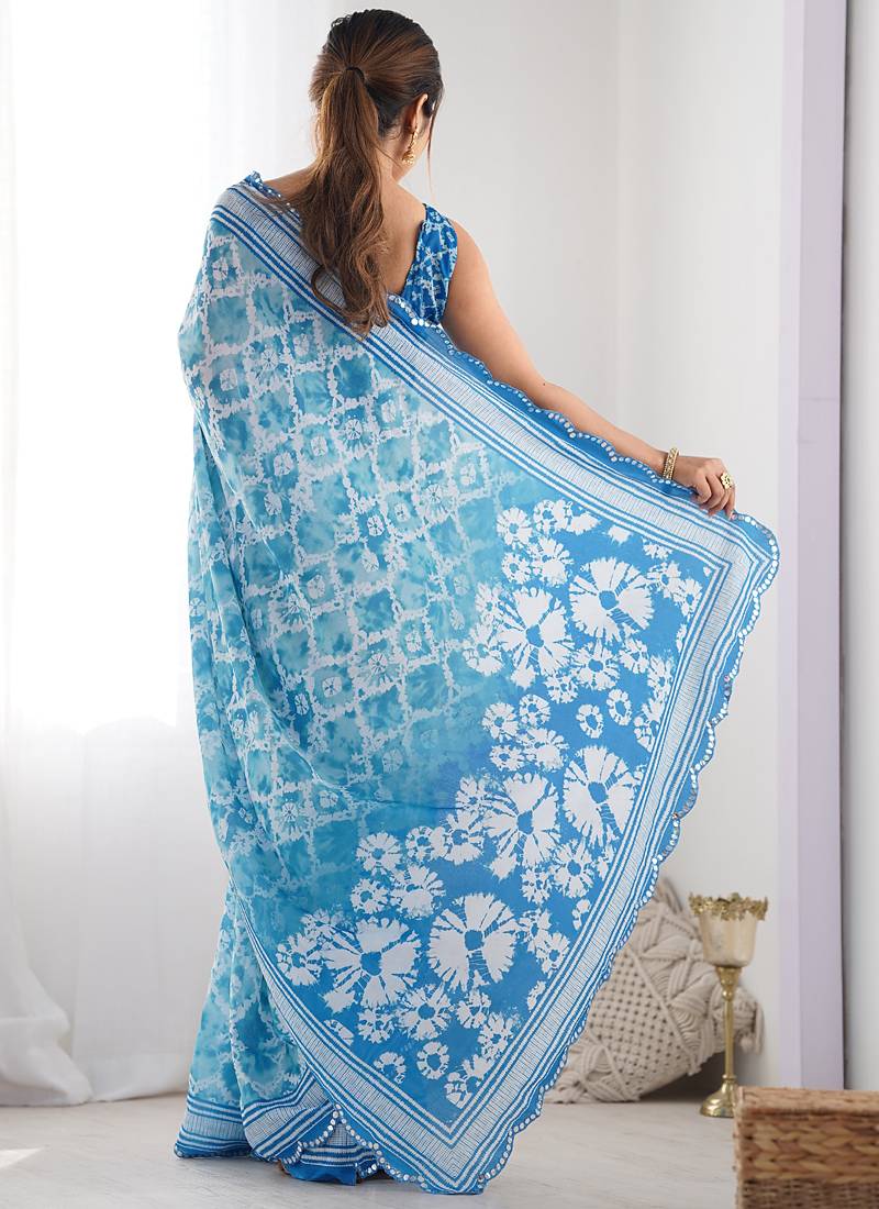 Sky blue chinon silk blend print work with mirror work border designer saree