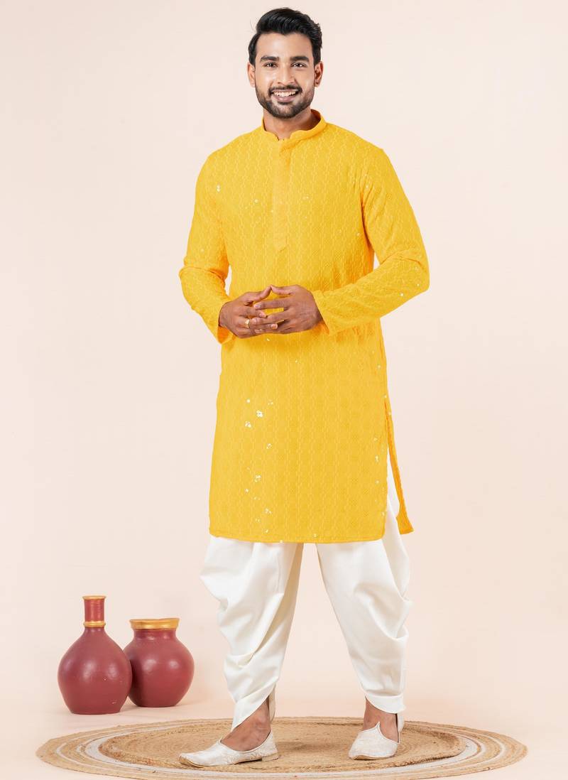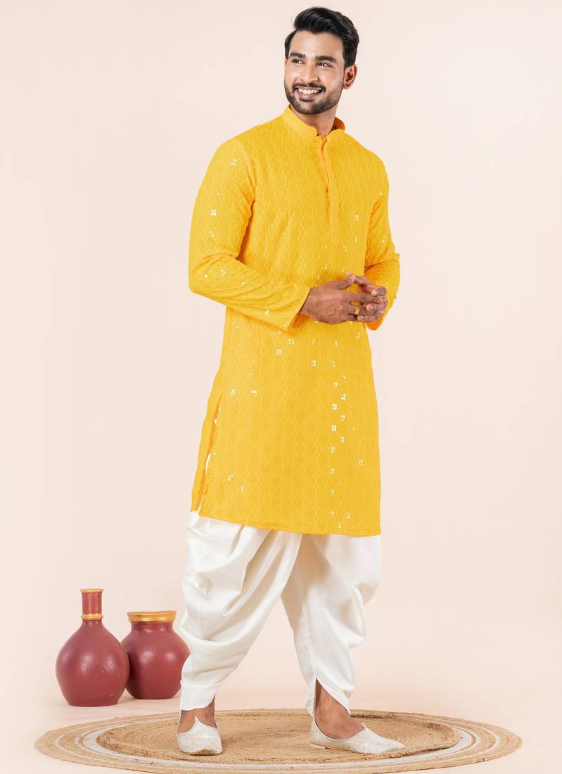 Yellow embroidery sequence kurta dhoti set for festive, reception, weddings